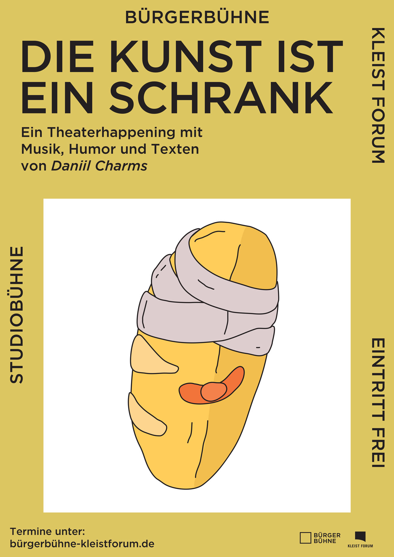 Der russische Wortkünstler und Pionier des Absurden, Daniil Charms, nimmt die Lesenden mit in eine Alltagswelt, die keine Pointen kennt und dennoch zum Lachen ist. Gegen das stalinistische Russland rebelliert Charms mit präziser Wortzauberei und zeigt die verborgene, mauseähnliche Geschäftigkeit, in der es nur Nichtigkeiten zu entdecken gibt. In der Stückentwicklung »Die Kunst ist ein Schrank« lassen Bürger*innen aus Frankfurt (Oder) Ordnung, Hygiene, Heldentum und alles, was praktischen Sinn hat, beiseite und feiern den Irrsinn und die große Freiheit. Schließlich sind nicht nur die Texte von Daniil Charms auf herrliche und grausame Weise unlogisch, sondern auch unser Leben, die Politik und die Moral – und die Kunst ist frei und ein Schrank.